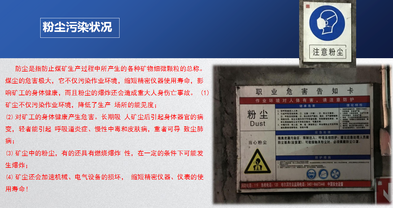 防尘是指防止煤矿生产过程中所产生的各种矿物细微颗粒的总称。煤尘的危害极大,它不仅污染作业环境,缩短精密仪器使用寿命,影响矿工的身体健康,而且粉尘的爆炸还会造成重大人身伤亡事故。 (1)矿尘不仅污染作业环境,降低了生产 场所的能见度; (2)对矿工的身体健康产生危害。长期吸 人矿